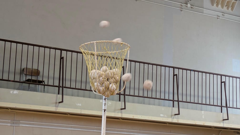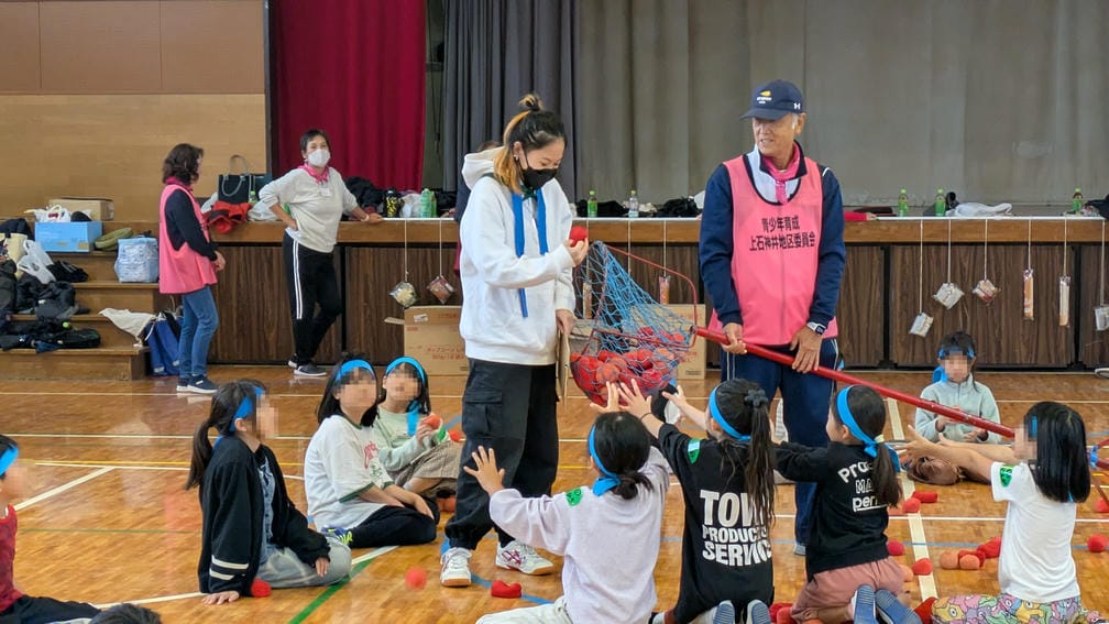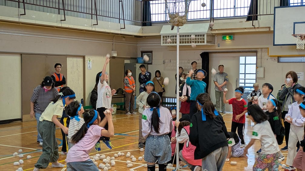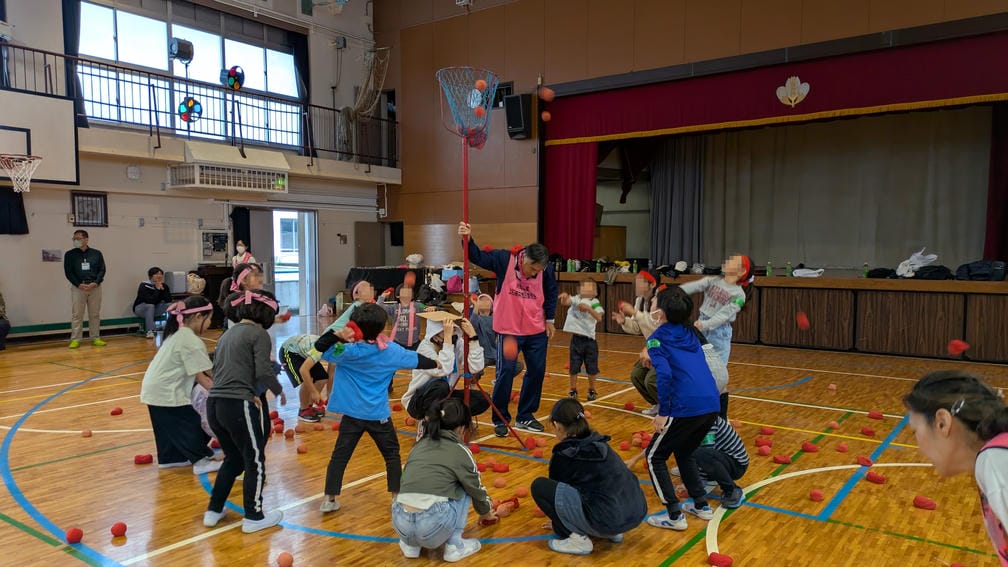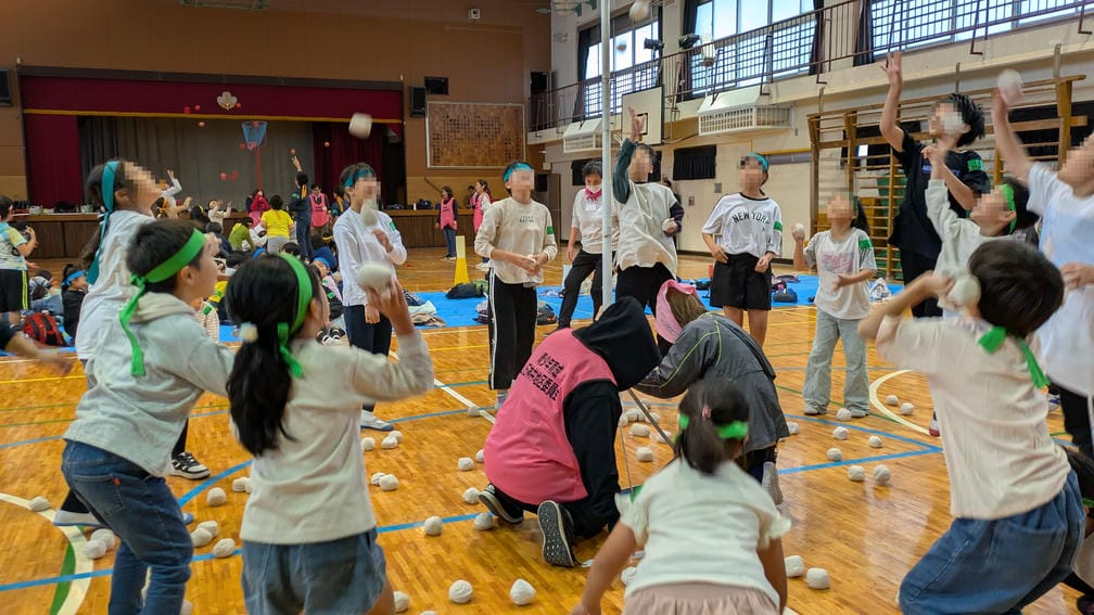 続いてはぷち運動会でやる予定だった「おどって玉入れ」です。玉入れは保護者世代だと運動会の定番種目ですが、ここ数年間は運動会ではやっておらず経験している在校生はもういない…これはこの楽しみを知ってもらうしかないよね!?ってことで体育館の中で実施!