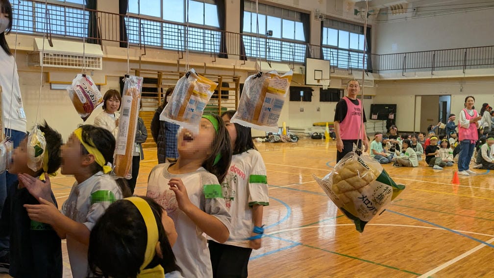 パンは参加賞として持って帰ってもらいました、歩きながら食べないように「帰ってから食べてね」の注意も忘れずに。 (事前にパン食い競争の周知とアレルギーの確認済み。また、口が触れたり落ちたものは拭いて衛生を考慮。)