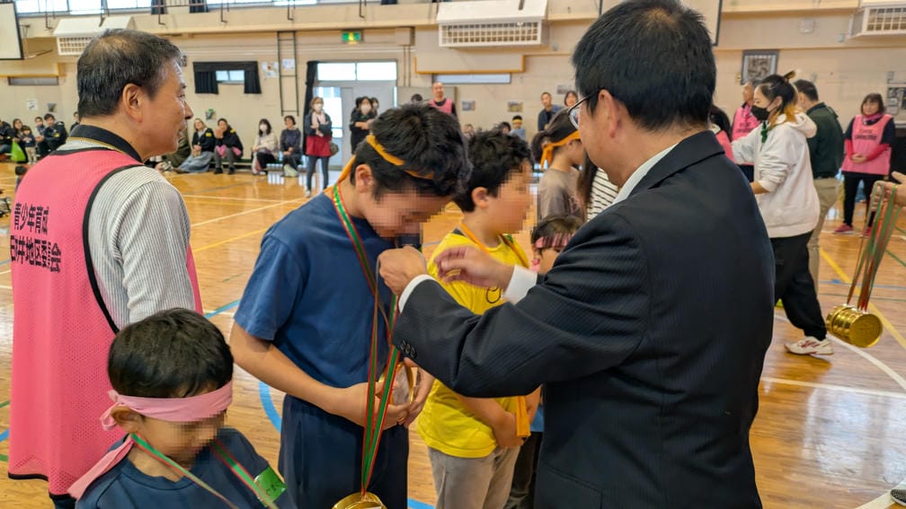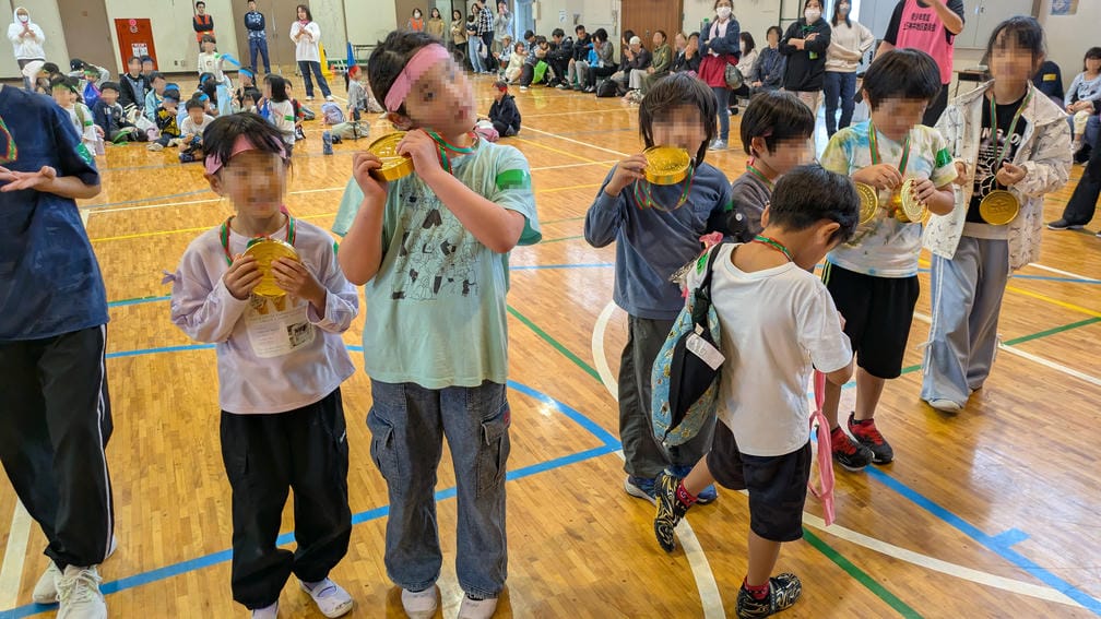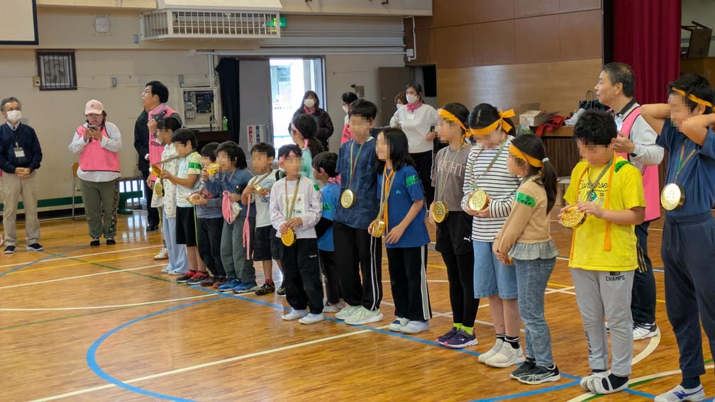 さて、全ての競技が終了したので結果発表と表彰式です。色々な競技をやりぷち運動会な雰囲気になっていますが、そう…今日は雨で「ドッヂビー大会」でした。低学年の部と高学年の部それぞれの順位を発表し一位のチームは前に出て整列、一人ひとりの首に金メダルを掛けてあげて記念撮影をします。激しい戦いを勝ち抜いた子たちの顔は晴れ晴れとしていました。