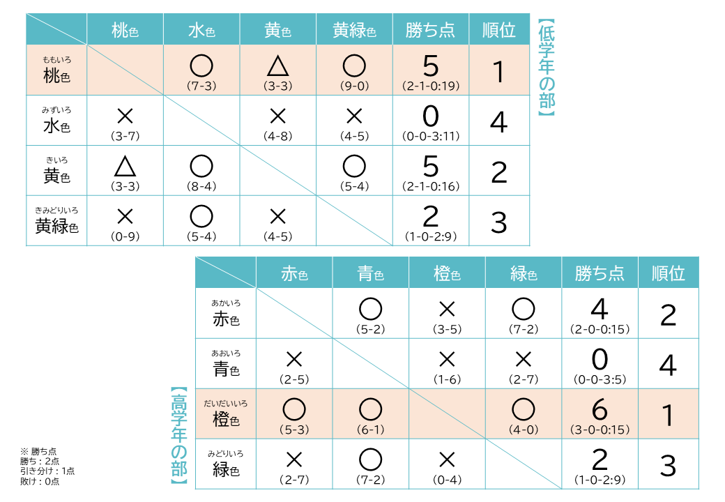 低学年と高学年で別々にチームを作り総当たり戦をした結果です。