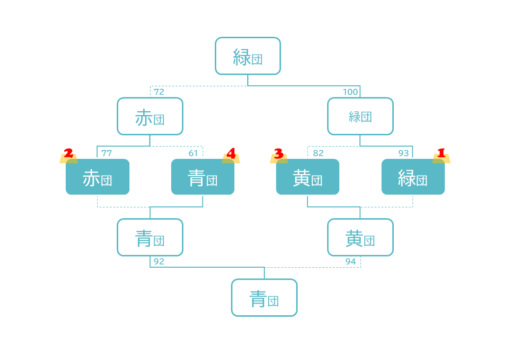 四色の団に分かれて勝ち上がり/敗け下がり戦をした結果です。